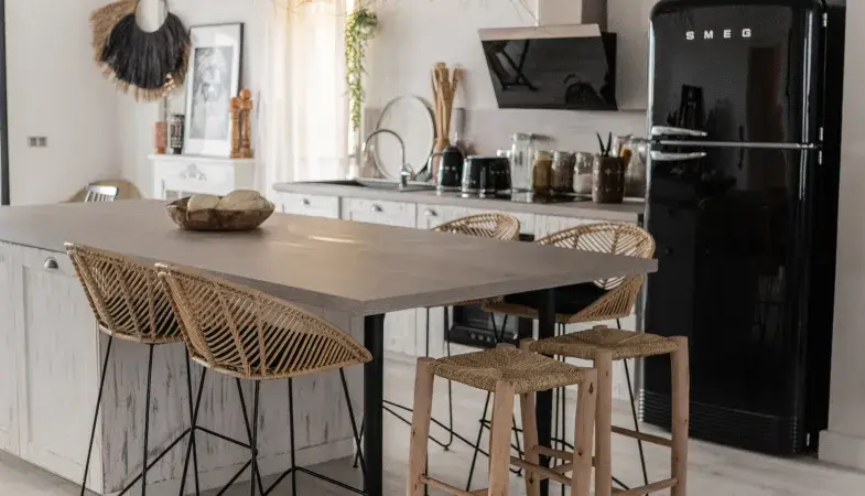 When it comes to furniture, primary textures are clearly on-trend! Wood continues to top the popularity charts for the ethic style with its natural appearance. Some species in particular are a favourite with their many colours and varying grain, which gives the impression that the object has been sculpted from a piece of bark. Similarly, uncoloured wicker, rattan and other plant fibres can be used on the armchairs or as pot covers. But an ethnic interior would not be complete without a metallic touch. Whether a shelf or the end of a sofa, all it takes is a single touch of dark metal to make its strong character felt in this exotic interior.