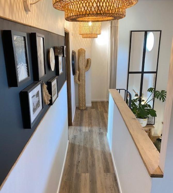 In a long corridor, not much is needed to preserve a feeling of space and light. Green plants break up a white corridor, all while maintaining a neutral flow to connect all the rooms of the house. A magnificent photo wall, like this one by @elledekor, can decorate this space and turn it into a real cabinet of curiosities: an ideal place to display the family’s happy memories. Finally, a beautiful wicker chandelier brings it all together with a warm and cosy touch.